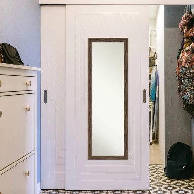 This 100% real wood, full-length Non-Beveled Mirror framed in the Regis Barnwood Mocha Narrow frame, complements your decor without the need for unsightly over-the-door brackets. Individually made using traditional custom framing techniques, it has the quality you would expect from your local frame shop. It holds its value with premium finishing that can be appreciated up close. Our On The Door Mirror has two hooks to hang directly on your door or wall without additional anchors or brackets. Hang it on the back of a closet, bedroom or bathroom door, or on the wall as a standard full-length mirror. Because of our attention to detail and focus on artistry, architects, interior designers, and homeowners alike choose this mirror to create beautiful living spaces.