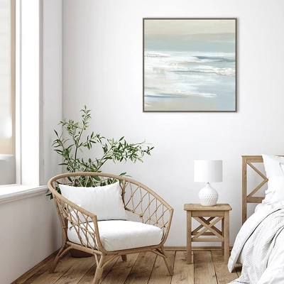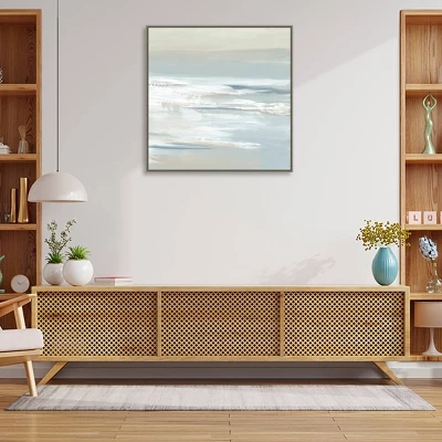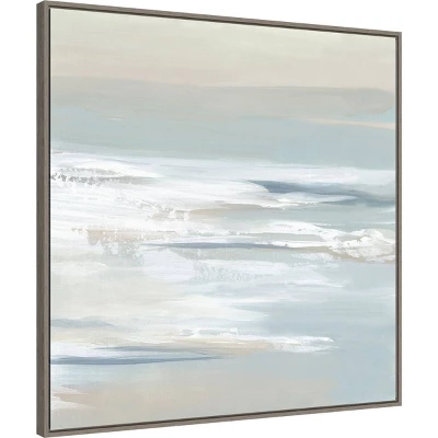 ART DESCRIPTION: With its muted blues and grays and a hint of sandy beach, this painting gently transports the observer to a tranquil ocean landscape. The abstract waves will add a sense of calm to any room. This Amanti Art canvas art print was created by Lera and printed by Amanti Art in Madison WI. The canvas is stretched by hand and finished with a float frame. Individually made using traditional custom framing techniques, it has the quality you would expect from your local frame shop. Because of our attention to detail and focus on artistry, architects, interior designers, and homeowners alike choose this framed canvas artwork to create beautiful living spaces.