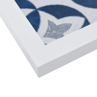 - Framed wall art set with 3 different distressed and textured tile patterns in blue, white and gray and solid white frame