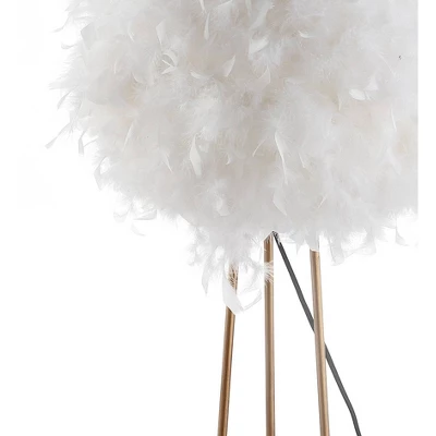 Light as air, this chic floor lamp is charming and contemporary adorned in white feathers. With a single bulb and brass base, the scene-stealing feather dome softens the light while retaining a contemporary aesthetic that blends well with any style of decor. And at only 52″ high, its small scale is well-suited for any floor or room.