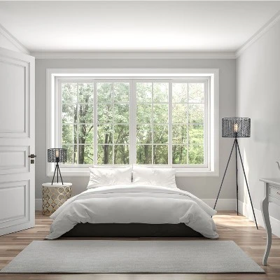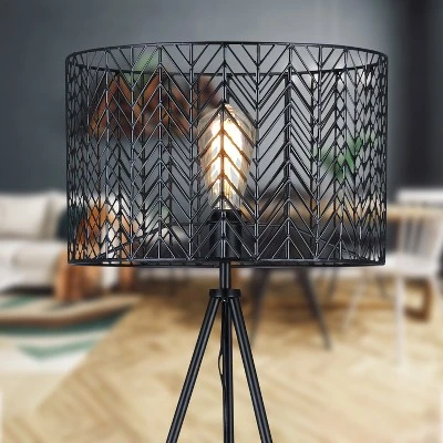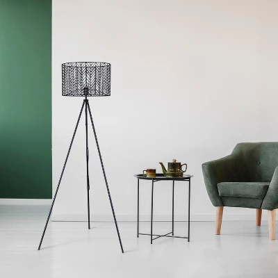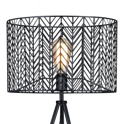 Elevate your living room, entryway or bedroom decor while adding convenient lighting with the 61″ Ingrid Black Cage-Shade Metal Tripod Floor Lamp from River of Goods. Featuring an all-metal construction with a slender tripod-style base and industrial-inspired round cage shade, this matte black floor lamp complements a wide variety of color palettes and decor styles to blend in beautifully in your home. A 90-inch power cord provides ample reach to a wall outlet, and the cutout-covered metal shade lets one 60-watt E26 or equivalent LED bulb (not included) easily shine through. Place it near a favorite reading chair or corner of your sofa, or place it in your entryway to create warm, welcoming ambiance as guests enter your home.
