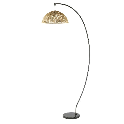 Accent your interior decor while bringing warm and welcoming lighting with the 77″ Renae Black Metal & Rattan Bowl Boho Floor Lamp from River of Goods. This floor lamp stands 77 inches tall for an eye-catching addition to any space, complete with a curved black metal stand enhancing its visual appeal. Sitting atop the stand is an intricately woven rattan shade in a bowl shape, lending your interiors a touch of natural flair and coastal style, and the marble base puts a polished finish on the overall design. The metal and rattan floor lamp requires one 60-watt E26 bulb (not included) to shine warm light through the textured shade, and a 90-inch power cord makes it easy to reach a power outlet from your preferred location.