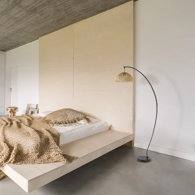 - Modern floor lamp with marble base, metal stand and rattan shade