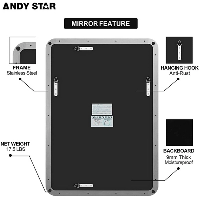 Start the day off with a mirror that matches your style. Enhance the modernity of your household with the ANDY STAR 24 x 36-Inch Rectangular Deep Metal Frame Hanging Mirror.This rectangular mirror is sure to bring a sophisticated accent to any living area. Quality is in the details, from a refined black finish, precise linework, and the gap between the frame and glass. This mirror presents beautifully under high-definition floating glass and medium-density fiberboard with no visual distortion. A broad rectangular shape with rounded corners offers increased vertical visibility so you can get an unobscured look at your reflection before the day begins. The heavy-duty, 2-millimeter by 2-inch stainless steel frame with multiple layers of waterproofing allows for a luxury appearance boasting long-lasting durability. This modern hanging mirror is rated for use in the bathroom, fireplace, entryway, living room, and other high-moisture areas.For all-in-1 convenience, all mounting hardware for installation is included. Perfect for refining you or your household’s aesthetic, the ANDY STAR 24 x 36-Inch Rectangular Deep Metal Frame Hanging Mirror is the high-end mirror you need to reinvent your daily routine.