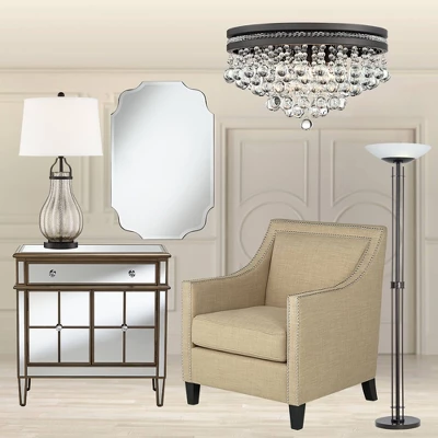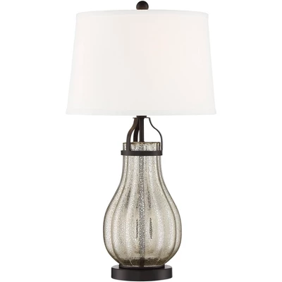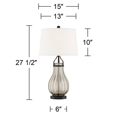 Light up your living space with this contemporary transitional table lamp from Franklin Iron Works. This lamp is made of metal in an oil-rubbed bronze finish, with a curving body of fluted mercury glass for a beautiful look. On top is a white drum shade for a classic finishing touch. Operate the light with the on-off switch located on the socket.