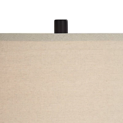 - Dark bronze finish. Metal construction. Oatmeal color fabric drum shades. 8-foot long cords.