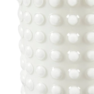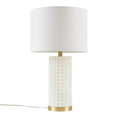 - Textured dot pattern on cylinder base made from white glass and paired with gold base and drum shaped fabric shade