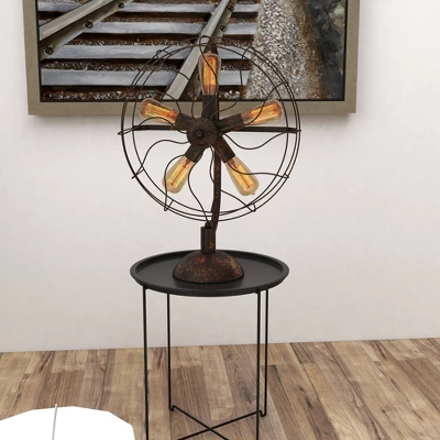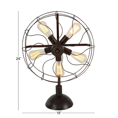 - An industrial accent lamp features five bulbs and a round, open-cage design to mimic the appearance of a traditional fan