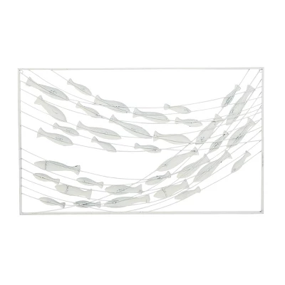 - This rectangular wall art features an open-style sculpture of blue-toned fishes swimming together