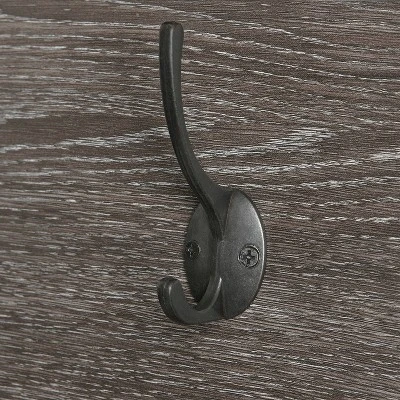 Attractive wall shelf features versatile wood grain texture, adding timeless character to any room. Includes three open cubbies for small baskets, bins, hats, mittens and other entryway necessities. Four double coat hooks perfect for hanging bags, jackets, dog leashes or keys. Add beautiful, woodgrain appeal throughout the entire home with five additional Woodbury Collection items.